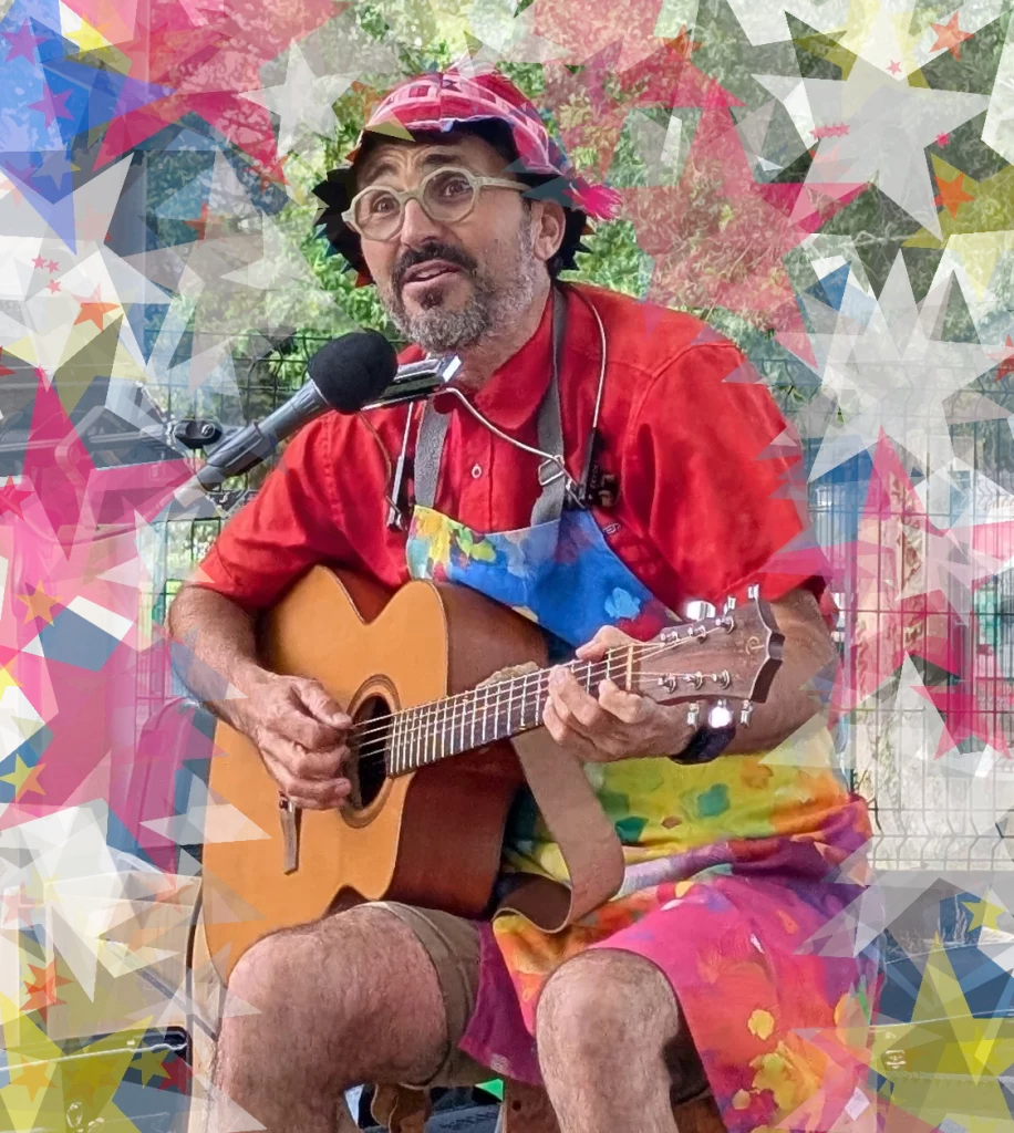 Concert familial avec machine à bulles (été) ou boule à facettes (hiver).